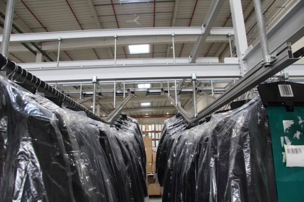 Une fois les pièces textiles contrôlées, elles sont placées sur un convoyeur aérien descendant à destination de la zone d’expédition. Elles sont ensuite colisées et expédiées vers leur destination finale.
